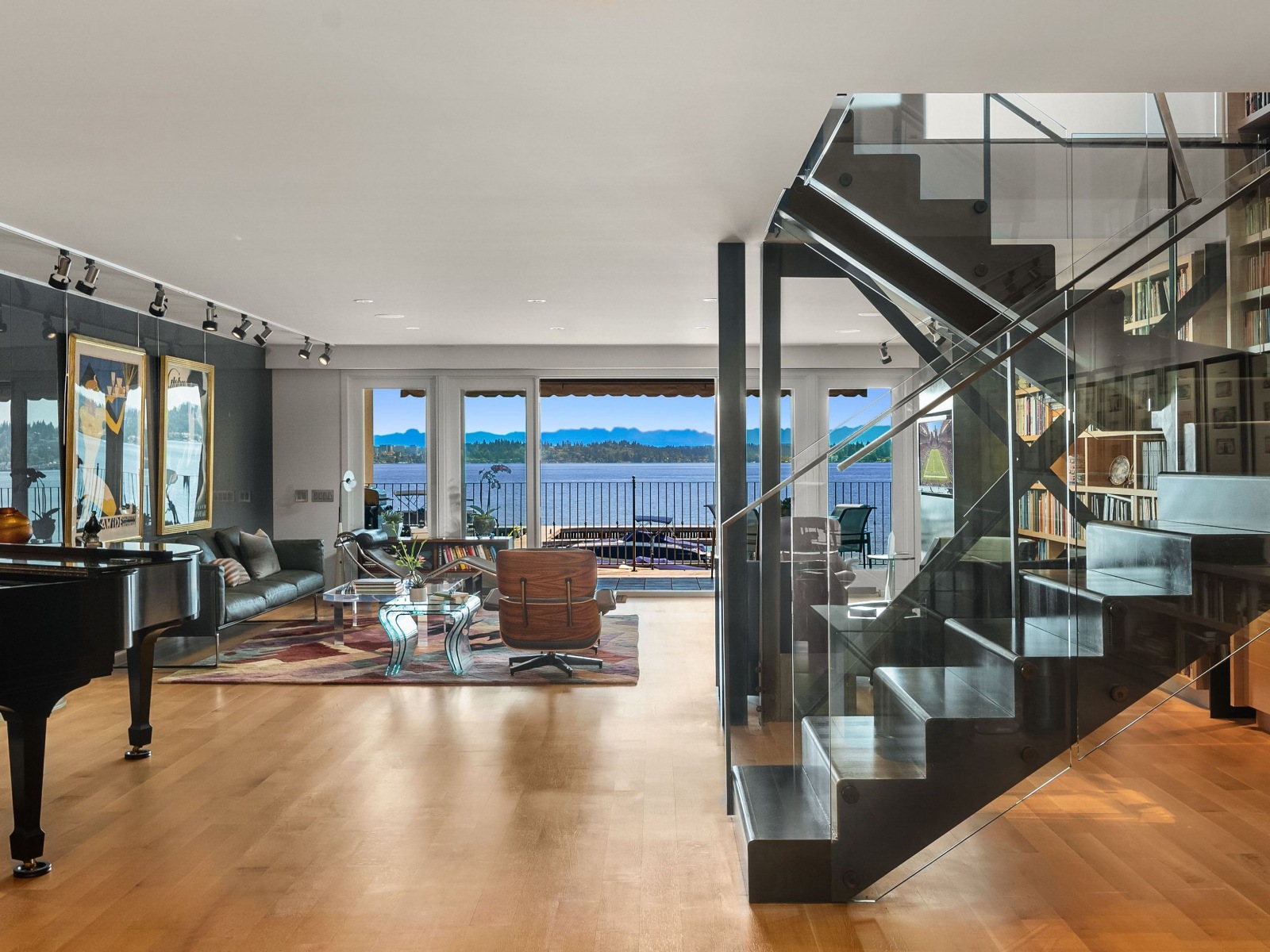 Your hosting dreams come true in this entertaining-friendly abode, with a gorgeous, generously sized roof deck overlooking Lake Washington. Clear, wrap-around railings give the illusion of floating on a cloud. Wide, double doors at the entry welcome your guests into the light-filled home and the chef’s lakeview kitchen.