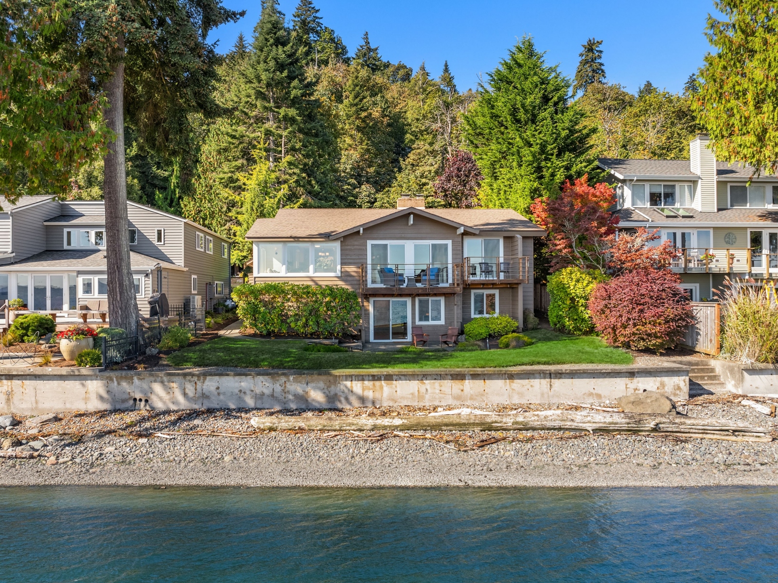 What’s your dream Pacific Northwest view? Mt. Rainier? Mt. Baker? Downtown Seattle? You’ll get all three in this thoughtfully updated home on Bainbridge Island’s Rockaway Beach. The open-concept floor plan welcomes in water views, from the main-floor primary suite to the family room, which opens to a waterside backyard and 60 feet of fully bulkheaded, no-bank waterfront.
