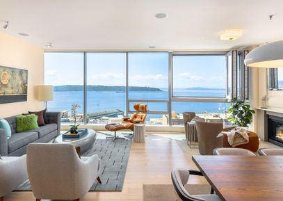 A sense of tranquility reigns in this exquisite 9th floor West facing home with captivating views of Elliott Bay, Pike Place Market, Olympic Mountains. The primary suite and guest bedroom are facing the water and mountains. Spacious condominium has comfort touches with significant interior enhancements: custom cabinetry in office/media room which can be closed off for potential third bedroom. Blackout shades in bedrooms, blinds in living room, EV with large parking stalls and generous storage. Bi-fold windows open and overlook... |