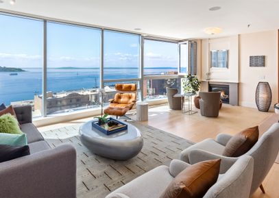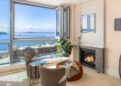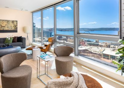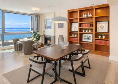 A sense of tranquility reigns in this exquisite 9th floor West facing home with captivating views of Elliott Bay, Pike Place Market, Olympic Mountains. The primary suite and guest bedroom are facing the water and mountains. Spacious condominium has comfort touches with significant interior enhancements: custom cabinetry in office/media room which can be closed off for potential third bedroom. Blackout shades in bedrooms, blinds in living room, EV with large parking stalls and generous storage. Bi-fold windows open and overlook... |