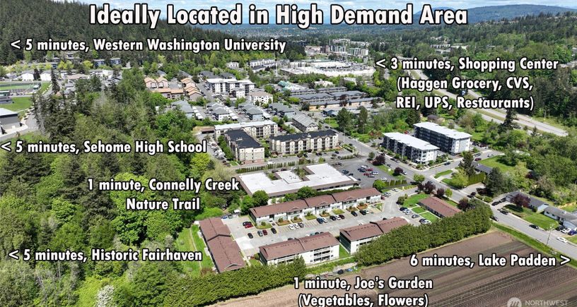 This well-maintained 57-unit apartment/townhouse complex (5 bldg) is in a high demand area, 1 mile from WWU. Strong reliable rental history. Roofs replaced and exterior painted last 3 years; windows new with dbl pane. Units remodeled (countertops, cabinet faces, flooring fixtures, upgraded appliances). Full size washer/dryer in each unit. Rare opportunity:land is zoned for 27 additional units. 2 minutes from I/5, Historic Fairhaven, excellent shopping, and next to Joe’s Garden. All units have 2 bedrooms (53 – 850 sq... Listing Courtesy of Northwest MLS / Windermere Real Estate Whatcom |