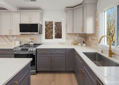 This fully remodeled 5-bed, 2-bath Craftsman blends modern style with a warm sense of home. Natural light pours through new windows, illuminating a layout designed for gathering and relaxing. The kitchen features quartz countertops, an imported marble backsplash, a waterfall island, and premium Bosch & LG appliances. Brushed gold fixtures add elegance, while new Bosch mini splits and a heat pump provide year-round comfort. Set on a desirable corner lot, the home offers a low-maintenance yard with luxurious artificial turf,... Listing Courtesy of Northwest MLS / Coldwell Banker Bain |