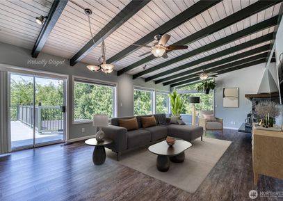 Pride of Ownership on Steroids! Upper LVL boasts vaulted beam ceilings, comm. grade LVP, quartz Island Kitchen w/soft-close custom cabinetry, double oven, Dining Area, Living RM w/large windows & Olympic Mtn views, dual Lopi wood-burning inserts, Office/Den, Utility RM w/Washer/Dryer and 3/4 bath, slider out to 780 sq.ft. Deck w/alum balusters. Main LVL offers Primary BR w/wood-burning FP and full bath, 3 addtl BRs, shared full BTH w/dual sink vanity, mud RM off 2-car garage w/rubber floor, insulated doors, 220V 50A service.... Listing Courtesy of Northwest MLS / Fathom Realty WA LLC |