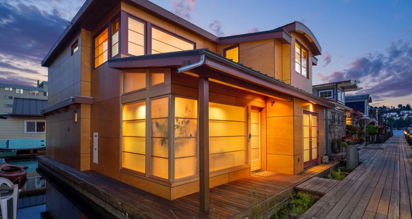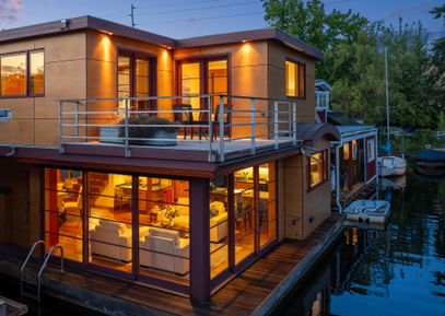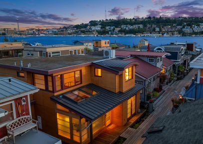 Custom-built Japanese-inspired NW Contemporary floating home juts into its sunny south-side slip—a rare placement offering unobstructed channel views of Lake Union. Corner living room glass sliders fuse interior space with the water’s edge for seamless indoor-outdoor living. The expansive 3-level floor plan features three proper bedrooms, a concrete float with a full-height finished basement, CVG fir cabinetry and trim, exposed beam ceilings, and exterior clad in PRODEMA® siding. Modern comforts such as Fiber internet,... |